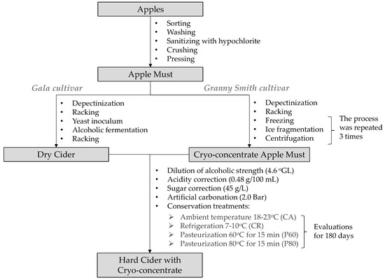 In this research, a new hard cider was evaluated. Depectinized apple juice from the Gala cultivar, containing 12.2 g/100 mL SS, was placed in two fermenters (50 and 30 L) made of stainless steel AISI 304, with a usable volume of 45 L and 25 L, respectively, temperature control, pressure resistance (9 bar), safety valve, and gasification system (Grupo Musso Inox, Vila Velha, ES, BR). The apple musts were inoculated (106 CFU/mL) with Saccharomyces cerevisiae Reims (Fermol Reims Champagne, PB 2002, AEB Group, BSa, IT). Alcoholic fermentation occurred during 20 days of anaerobiosis at 20 °C. After removing the lees, the two ciders were mixed and homogenized. Sulfite was not evaluated. The dry cider was racked and stored in a cold room at 5 °C (Frilux, RF-054-ESP, Mafra, SC, BR) (Figure 1).