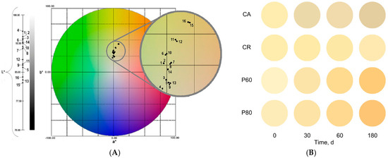 Cartesian position of the samples in the CIELAB* system (A) and conversion of the CIELAB system into colors (B). Note: L*: luminosity; a*: green–red parameter; b*: blue-yellow parameter. The number shown in the figure = sample code—day of storage (i.e., 1: CA-0); 1: CA-0; 2: CR-0; 3: P80-0; 4: P60-0; 5: CA-30; 6: CR-30; 7: P80-30; 8: P60-30; 9: CA-60; 10: CR-60; 11: P80-60; 12: P60-60; 13: CA-180; 14: CR-180; 15: P80-180; and 16: P60-180. CA: ambient control (18–23 °C); CR: cider stored under refrigeration (7–8 °C); P80: cider pasteurized at 80 °C for 15 min; and P60: cider pasteurized at 60 °C for 15 min. Data from ciders stored for 120 days were not used.