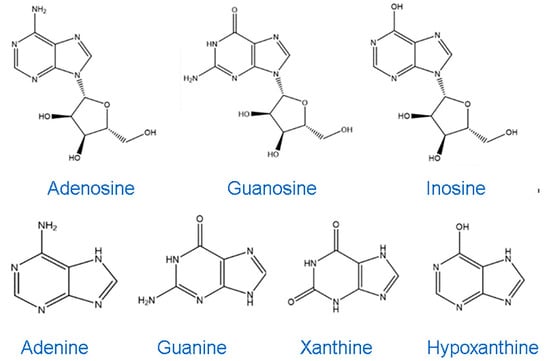 Purines (C5H5N4) are amphoteric compounds that are highly soluble in water and alcohol but insoluble in non-polar solvents. They are formed by the condensation of a pyrimidine ring and an imidazole ring. First named by Emil Fischer, purines are essential components of nucleic acids and play crucial roles in genetic regulation, energy metabolism, coenzyme formation, and metabolic regulation in living organisms []. Purine analogs present in nature are shown in Figure 1, starting with simple units in the form of free nucleobases (adenine, guanine, xanthine, hypoxanthine), which consist only of purine or pyrimidine rings. When these nucleobases are bound to the ribose or deoxyribose through glycosidic bonding, nucleosides are formed (adenosine, guanine, inosine); these molecules can mediate cellular signaling, but still need to be linked to 1–3 phosphate groups on the 5’ carbon of the sugar via a phosphate bond to be upgraded to a nucleotide that functions as both a carrier of genetic information and an energy currency []. As purines contain conjugated double bonds, there is a strong absorption at the UV wavelength of 260 nm, which can be used for quantitative or qualitative detection of purines [].