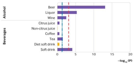 The correlation between beverages and serum urate concentrations []. Purple: Serum urate-raising effect; Yellow: Serum urate-lowering effect; Red line: Bonferroni corrected multiple-testing significance threshold (p < 7.94 × 10−4); Blue line: Nominal significance level (p < 0.05).