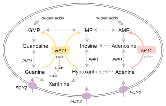 - Alfonzo, J.D.; Crother, T.R.; Guetsova, M.L.; Daignan-Fornier, B.; Taylor, M.W. APT1, but not APT2, codes for a functional adenine phosphoribosyltransferase in Saccharomyces cerevisiae. J. Bacteriol. 1999, 181, 347–352. [Google Scholar]