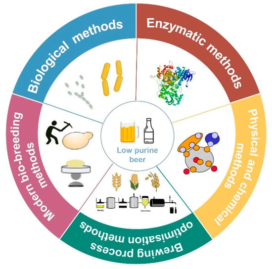 Chen et al. [] proposed a method for reducing the purine content of food by using specific microorganisms to degrade and absorb purine analogues, followed by timely filtration to remove the organisms and prevent autolysis. In their study, they added Aspergillus oryzae ATCC 26831 (1.3 × 106 cfu·mL−1) to three different aqueous mushroom extracts for 48 h, achieving total purine content reductions of 84%, 61%, and 97%, respectively. Deng et al. [] applied B. adeninivorans CICC33223 and prion-producing pseudomimetic yeast (Candida utilis) CICC 32604 for co-fermentation during the preparation of low-purine soymilk powder. After filtration, concentration, and drying, the total purine content of the final soymilk powder was only 4.5–6.6% of the content found in regular soymilk powder. Recent studies have also found that certain strains of Lactobacillus, including Lactobacillus plantarum DM9218-A [], Lactobacillus fermentum 9–4 [], and Lactobacillus gasseri PA-3 [], are involved in the metabolism and degradation of purines. This indicates that lactobacilli could be employed in the development of low-purine foods and beers. However, the use of these bacteria would significantly change the taste and aroma of the beer.