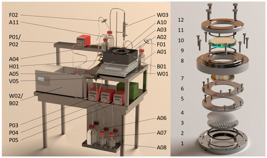 (Left) Illustration of the biofilm reactor with the designations V05 (three-way valve for draining), F01 to F02 (sterile filter), A01 (gassing humidification), A02 (biofilm reactor chamber), A03 (overflow recirculation tank), A04 (level control module), A05 (process control unit), A06 (draining apparatus), A07 (acid feed tank), A08 (base feed tank), A10 (condensate trap), A11 (exhaust gas drying), from W01 to W02 (heat exchanger), W03 (exhaust gas cooling), from B01 to B02 (water bath), H01 (lifting platform for level adjustment), and from P01 to P05 (peristaltic pump). (Right) Exploded view of the biofilm reactor chamber with a synthetic biofilm. Component numbering from bottom to top: bottom part with tangential liquid inlet (1), flat gasket (2), biofilm support grid (3), optional microfiltration membrane (4), lower casting frame (5), upper casting frame (6), synthetic biofilm (7), lower part of the cover (8), flat gasket (9), viewing glass (10), flat gasket (11), and viewing glass flange (12).