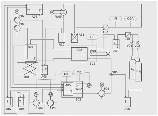 Piping and instrument flow diagram of the entire biofilm reactor, including the gassing and exhaust gas section, with the designations V01 and V02 (mass flow controller), V05 (three-way valve for draining), from F01 to F02 (sterile filter), A01 (gassing humidification), A02 (biofilm reactor chamber), A03 (overflow recirculation tank), A04 (level control module), A05 (process control unit), A06 (draining apparatus), A07 (acid feed tank), A08 (base feed tank), A09 (pressure equalization module), A10 (condensate trap), A11 (exhaust gas drying), from W01 to W02 (heat exchanger), W03 (exhaust gas cooling), from B01 to B02 (water bath), H01 (lifting platform for level adjustment), P01 to P05 (peristaltic pump), QIC (pH indicator control), TIC (temperature indicator control), FI (mass flow meter), and OGA (flue gas analysis).