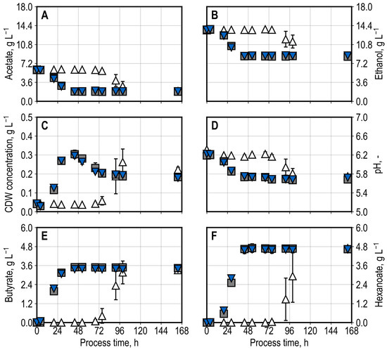 Batch processes in parallelized 500 mL anaerobic flasks (triplicates) with C. kluyveri suspended in 100 mL modified Hurst medium and inoculated at a temperature of 70 °C (white triangles), 45 °C (blue triangles upside-down), and 25 °C (gray squares), before cooling down to 37 °C, which took approx. 30 min for the flasks at 70 °C and 10 min for those at 45 °C. Incubation at 37 °C and 100 rpm with a gas mixture of 1:9 N2:CO2 at 1.5 bar absolute and 15 g L−1 ethanol and 6 g L−1 acetate as substrates. Shown are cell dry weight concentration in suspension (A), pH (B), and the concentrations of acetate (C), ethanol (D), 1-butyrate (E), and 1-hexanoate (F).