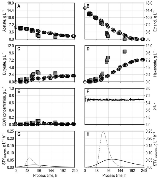 Heterotrophic batch processes with C. kluyveri in a continuously gassed biofilm reactor (cx,0, in Biofilm = 0.82 g L−1, pCO2,in = 200 mbar, pN2,in = 800 mbar; FGas = 5 L h−1, T = 37 °C, pH 6.8 controlled with 2 M H2SO4 or 3 M NaOH). Experiment with yeast extract in the medium is shown as gray squares and dashed gray lines (n = 1), and without yeast extract in the medium is shown as translucent circles and black lines (n = 2, black lines mark the minimum and maximum value). Shown are the substrate and product concentrations of acetate (A), ethanol (B), 1-butyrate (C), and 1-hexanoate (D), the CDW concentration in suspension (E), the pH (F), and the space-time yields (STY) of 1-butyrate and 1-hexanoate (G,H).