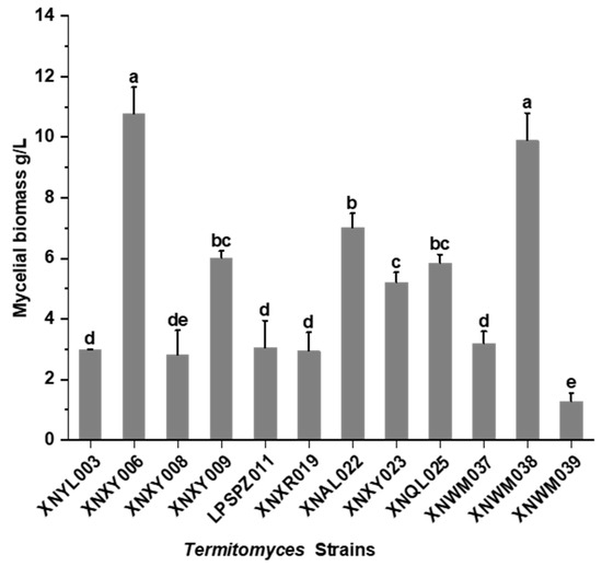 Biomass of Termitomyces strains under liquid fermentation. Different lowercase letters (a–e) indicate significant differences (p < 0.05).