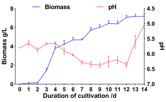 After culturing the mycelium on PDA for seven days, it was transferred to 100 mL of sterile water and homogenized to prepare a spawn suspension. The suspension was then inoculated into 100 mL of PDB at a volume ratio of 5% and cultivated at 25 °C and 120 rpm for 14 days. Samples were taken every 24 h, and the mycelium was filtered, washed with distilled water, dried at 50 °C until constant weight, and then weighed to determine biomass. The filtrate was centrifuged at 4000 rpm for 20 min and stored at 4 °C for the subsequent pH and antioxidant activity measurements.