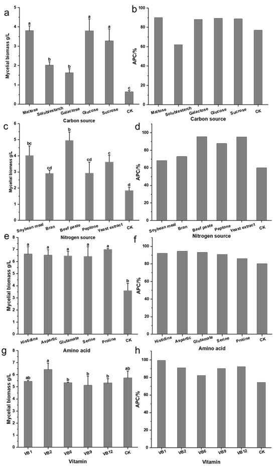 Effects of medium components on mycelial biomass (left: a,c,e,g) and APC value (right: b,d,f,h): (a,b) carbon sources; (c,d) nitrogen sources; (e,f) amino acids; (g,h) vitamins. (p < 0.05; the APC value is a composite index of antioxidant activity). Different lowercase letters (a–d) indicate significant differences (p < 0.05).