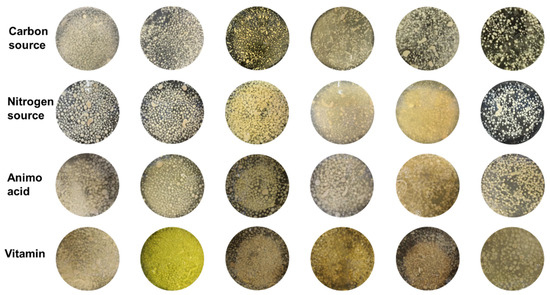 Growth status of mycelium in liquid culture with different components (carbon sources: maltose, soluble starch, galactose, glucose, sucrose, and blank carbon control; nitrogen sources: bran, soybean meal, beef extract, peptone, yeast extract, and blank nitrogen control; amino acids: histidine, aspartic acid, glutamic acid, serine, proline, and blank control; vitamins: VB1, VB2, VB6, VB9, VB12, and blank control).