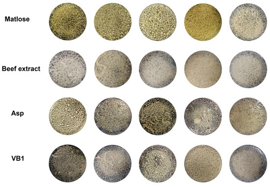 Growth status of mycelium in liquid culture with different concentrations of components (maltose: 20, 25, 30, 35, and 40 g/L; beef extract: 1, 1.5, 2, 2.5, and 3 g/L; Asp: 0.1, 0.15, 0.2, 0.25, and 0.3 g/L; VB1: 0.1, 0.15, 0.2, 0.25, and 0.3 g/L).