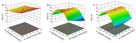 The contour map and response surface map (a–c) of the three-factor interaction of the medium were the response surface maps of the interaction between A and B, A and C, and B and C, respectively.