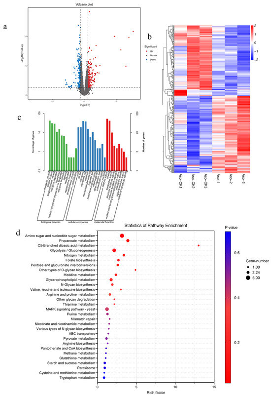 Comparative analysis of the CK and Asp groups: (a) volcano plots; (b) cluster analysis; (c) GO annotation; (d) KEGG pathway enrichment.