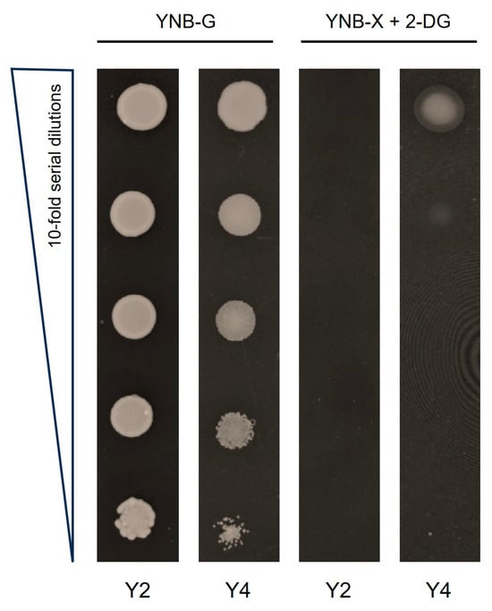 Effect of 2-DG on xylose utilization by W. anomalus UEMG-LF-Y2 (Y2) and D. rugosa UEMG-LF-Y4 (Y4). Yeast strains were grown in YNB medium supplemented with glucose (YNB-G) or xylose (YNB-X), with 2-DG added only to YNB-X. Serial tenfold dilutions (10−1 to 10−5) were spotted onto agar plates.