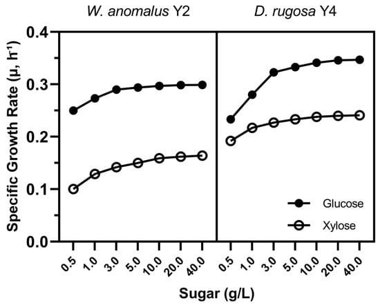 The growth performance of W. anomalus Y2 and D. rugosa Y4 was initially evaluated in YNB medium containing increasing concentrations of either glucose or xylose (0.5–40 g/L). As shown in Figure 2, both strains exhibited higher specific growth rates (μ, h−1) in glucose than in xylose at all tested concentrations. D. rugosa Y4 consistently outperformed W. anomalus Y2, reaching maximal μ values of 0.347 h−1 (glucose) and 0.241 h−1 (xylose), whereas W. anomalus attained 0.299 h−1 and 0.164 h−1, respectively. Growth rates in both yeasts tended to plateau at substrate concentrations of 20 g/L or higher.