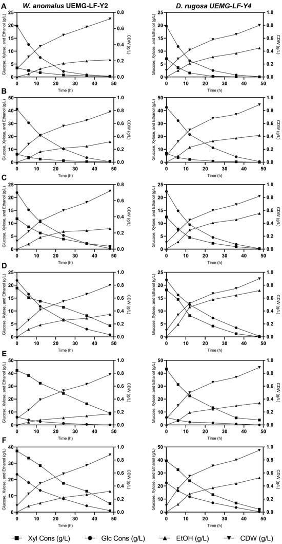 Additional batch fermentations were then performed with mixed glucose/xylose substrates (Conditions A–F) (Figure 3). Among these, Condition F (20 g/L glucose + 40 g/L xylose) (Figure 3F) led to the highest cell dry weight (CDW) at 48 h, reaching 0.88 g/L for W. anomalus Y2 and 0.95 g/L for D. rugosa Y4. D. rugosa Y4 consistently maintained higher CDW values throughout the fermentation, while W. anomalus Y2 showed a more pronounced decline after 24–36 h.