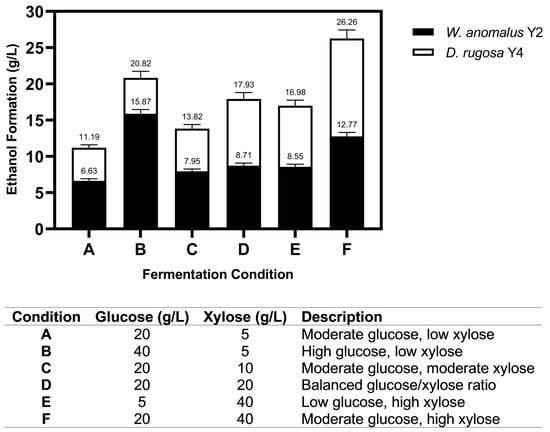 Figure 4 provides a comparative summary of total glucose and xylose consumption across the tested conditions. W. anomalus Y2 exhibited lower xylose utilization efficiency compared to D. rugosa Y4, with a residual xylose concentration detected in all conditions where xylose was present. In contrast, D. rugosa Y4 demonstrated a more efficient co-metabolism of glucose and xylose, particularly under Conditions E and F, where over 80% of the available xylose was consumed within 48 h. These data suggest a strain-dependent preference in sugar utilization and ethanol production efficiency.
