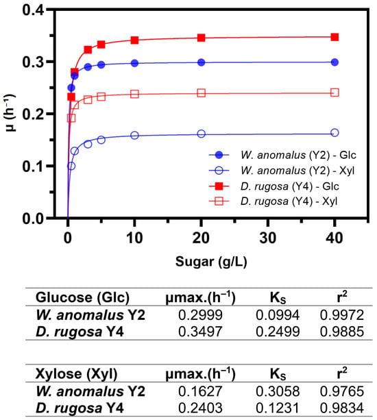 Monod model fitting for the specific growth rate (µ, h−1) of W. anomalus Y2 and D. rugosa Y4 in media containing different concentrations of glucose and xylose. Symbols represent experimental data, while solid lines indicate the model fit. The kinetic parameters µmax and KS were estimated based on the best-fit curves for each sugar. The goodness of fit was assessed using the coefficient of determination (r2).