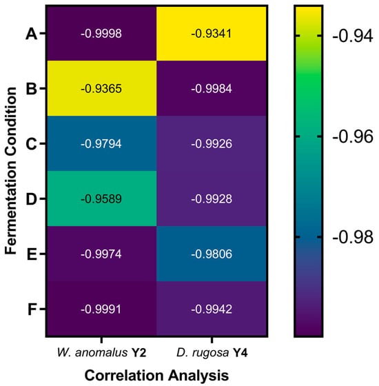 Pearson’s correlation coefficients (r) were calculated to assess the relationship between ethanol accumulation and residual xylose under different fermentation conditions. As shown in Figure 6, all correlations were strongly negative, indicating an inverse relationship between ethanol concentration and xylose consumption. For W. anomalus UEMG-LF-Y2, the correlation ranged from −0.9998 to −0.9365, with the strongest inhibition observed in condition A (r = −0.9998). In contrast, D. rugosa UEMG-LF-Y4 exhibited values between −0.9984 and −0.9341, with the highest inhibition occurring in Condition B (r = −0.9984).