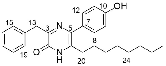 To elucidate the structure of the active fraction, MR7S4-F3 was run on HPLC-MS (high resolution, AB Sciex X500R QTOF) in ESI-positive mode. MR7S4-F3 gave a peak with m/z of 391.532 for [M + H]. The molecular formula generated from these peaks was C25H30N2O2, with nine double bonds. The possible structure of MR7S4-F3 was then investigated using a Bruker 500 MHz Ascend HD NMR. A detailed NMR analysis is shown in Table S2. The elucidation revealed a pyrazinone ring originating from two fused amino acids, namely phenylalanine and meta-hydroxyphenylglycine. The pyrazinone ring was further modified at the C-6 position with an octyl side chain, as shown in Figure 1.