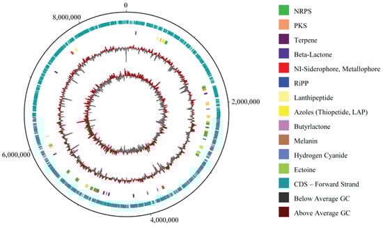 MR7S4 whole-genome sequencing followed by hybrid assembly of short and long reads yielded 14 contigs (Table S5), showing a completeness of 97.6% (Figure S6). The sample has a genome spanning 8,650,217 bp with a guanine–cytosin (GC) content of 71.63%, comprising 7534 coding sequences (CDS), 18 rRNA genes, 84 tRNA genes, and 1 tmRNA, totaling 7637 genes (Figure 3). The contig sequences associated with the genome have been submitted to GenBank and are available under accession number JBMGUW000000000.