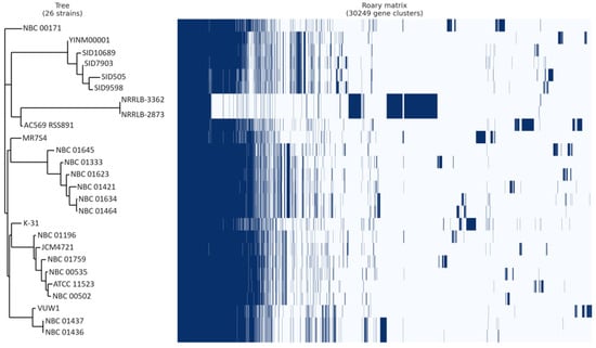 Streptomyces anulatus pangenome gene matrix. Juxtaposition of a phylogenetic tree constructed based on binary presence and absence of accessory genes, with the matrix showing the absence and presence of genes in all Streptomyces anulatus strains. In the matrix, blue cells represent the presence of a gene, while white cells indicate its absence.