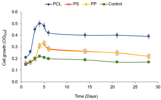 The initial selection of the halophilic community capable of degrading plastic was based on bacterial growth monitoring by measuring the optical density (OD600). The cultures were cultivated in a mineral medium containing 15% NaCl and plastic (0.3% PCL, PS, or PP) as the sole carbon source (Figure 1).