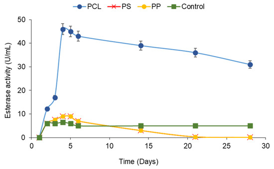 The highest values of esterase activity were recorded on the PCL substrate on the fourth day of cultivation—46 U/mL—followed by a slight decrease to 31 U/mL after 4 weeks. With PS and PP substrates on the fourth day, the esterase activity was 9 U/mL, dropped threefold after 2 weeks, and disappeared after 4 weeks of cultivation. In contrast, the control maintained esterase activity of about 5 U/mL throughout fermentation. Dense growth and formation of a significant biofilm were observed on the surface of PCL beads after the fifth day of cultivation, while the biofilm formed on PP was much smaller. No biofilm formation was observed on PS.