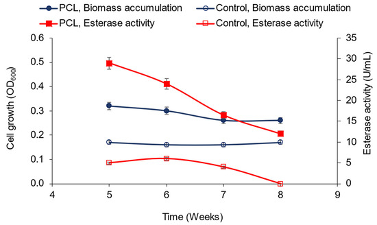 During the community’s fermentation of PCL from the fourth to the eighth week, a decrease in esterase activity (to 12 U/mL) and relatively constant biomass was observed. No esterase activity was visible in the control group by the eighth week. At the same time, a significant increase in biofilm on the plastic beads occurred. Biofilm formation was quantified during the first, fourth, and eighth weeks by measuring the optical density of the bacteria after washing the plastic beads with ethanol (Figure 5).