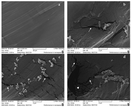The biodegradation activity of a bacterial community isolated from Burgas Lake. Scanning electron microscopy (SEM) micrographs illustrate the surface architecture of PCL plastic. (a) Control sample; (b–d) PCL samples cultivated with the bacterial community. The images show cracks, craters (white arrow), and holes (white triangle). Bars = 2–20 µm.