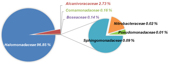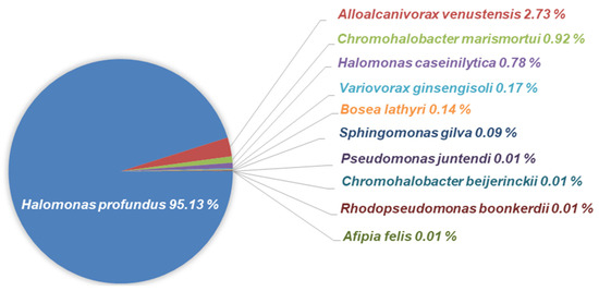 With the highest representation was the order Oceanospirillales (99.57%), which included three genera: Halomonas (95.92%), Alloalcanivorax (2.73%), and Chromohalobacter (0.93%). The main bacterial species in the community was Halomonas profundus, which comprised 95.13% of all species present. Alloalcanivorax venustensis (2.73%) and Chromohalobacter marismortui (0.72%) were present in much smaller percentages (Figure 8).