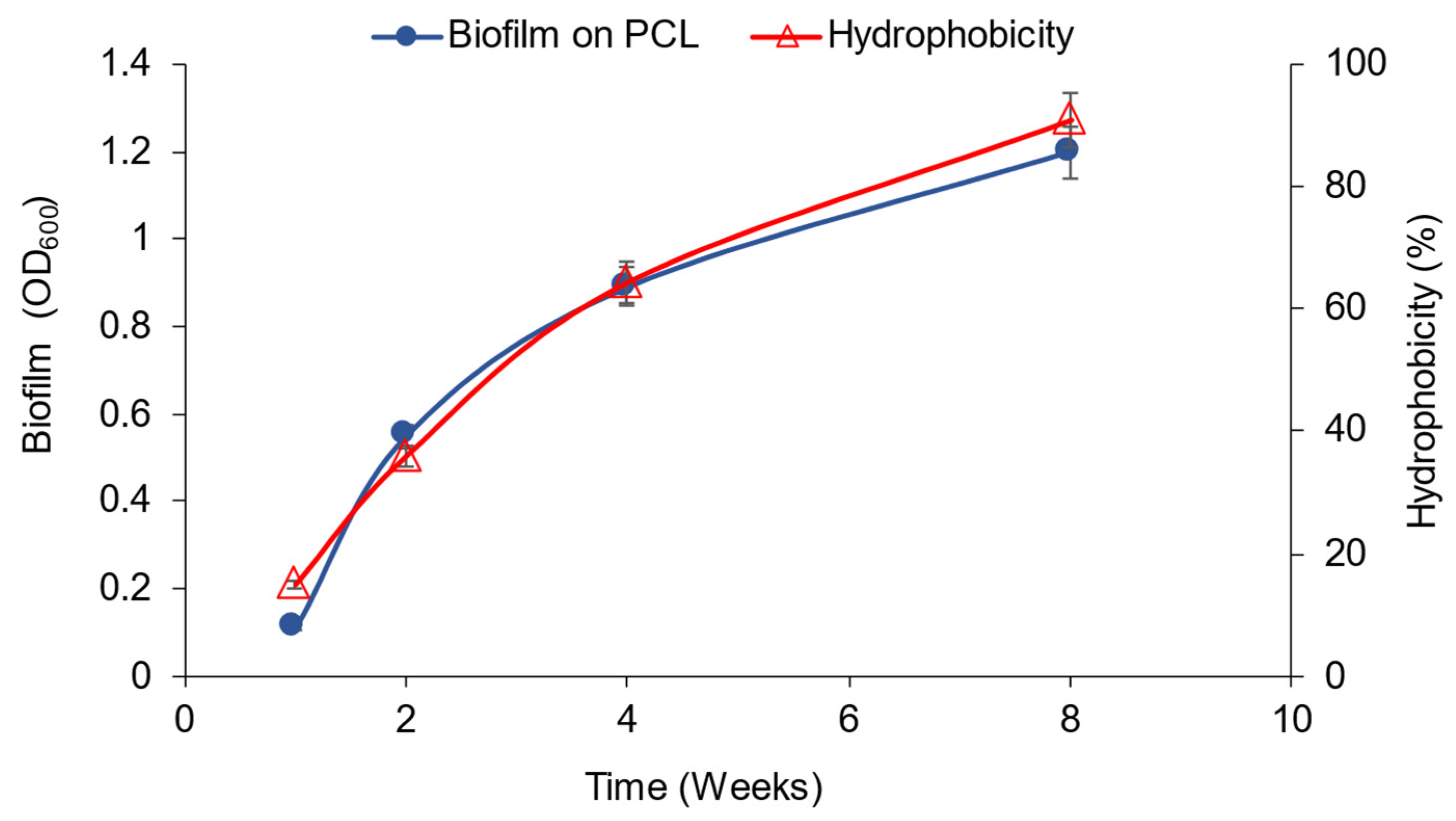 Visible biofilm on the surface of the plastic beads was observed after the fifth day of cultivation and increased during the cultivation, with the highest value at the end. The biofilm increased from OD600 = 0.11 (after the first week) to OD600 = 1.20 (after the eighth week), coinciding with the culture’s hydrophobicity rise.