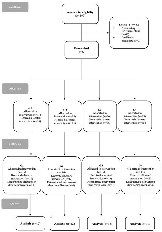 Of the total of 62 women, 11 were excluded from the study for various reasons; 5 did not complete the treatment, 2 did not receive the fermented beverage on time, and 4 did not show up for the blood test. Therefore, 51 women (G1 = 15, G2 =12, G3 = 13, and G4 = 11) completed the study.