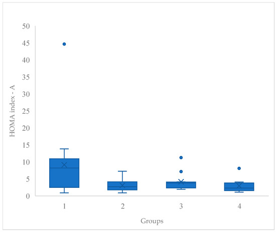 Figure 3 demonstrates that regarding the post-HOMA index, G1 had higher mean and median values than the other groups. This group also had a wider interquartile range, suggesting greater variability in the results. G2 and G4 had ranges and distributions that were more similar to each other, both with lower means and medians compared to G1.