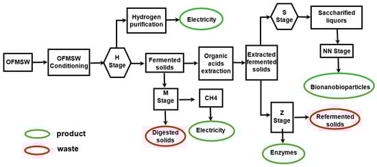 Our lab-scale biorefinery, also known as the GBAER type or HMEZS-NN BRF (where GBAER stands for the acronym in Spanish of the Environmental Biotechnology and Renewable Energies Group), produces bioenergy and bioproducts via six stages: (H) hydrogen production, (M) methane generation, (E) extraction of a concentrate of organic acids and solvents, (Z) production of industrial enzymes, (S) production of saccharified liquors, and (NN) production of bionanobioparticles (BNBPs) (Figure 1 and Table 1). Table 1 describes each step in detail [55]. As a first step, the OFMWS is received at the BRF gate. The processes of collection, recyclables’ separation (also known as sorting), and transport to the plant are not considered by other experts in their published works on LCA and sustainability analysis of MSW (Ebrahimian et al. [66]; Ebrahimian et al. [67]; Bozorgirad et al. [68]; Ma et al. [42], among others). Note that there is an implicit separation of recyclables upstream of the BRF, which could contribute to the circularity and to potential reduction in environmental impacts of the overall waste management approach. However, the recycling process is not part of the current BRF.
