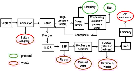 Flow diagram of incineration with energy recovery in this work. Based on various authors [70,71,72,73]. Notes: ESP—electrostatic fly ash precipitator, wet flue gas scrubber, SCR—selective catalytic reduction system, NSCR—non-selective catalytic reduction system.