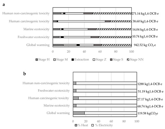 The Z and NN stages contributed significantly to eleven environmental impact categories, while the NN influenced six of the eleven impacts. Stage Z influenced five PEIs, with the highest contributions in MEc with 74.2% and HCT with 59.9%. The NN stage showed the most significant contributions to GW, FWEu, FWEc, MEc, and HMCT with 38, 53, 41.7, 44.6, and 49.5%, respectively. The potential GW emissions from the NN stage were estimated at 357 kg of CO2e, and the most significant contribution corresponded to the use of activated carbon in this stage for the production of BNBPs. On the one hand, the production of activated carbon (Table S10.8, Annex S10 in Supplementary Materials) is energy-intensive, with an input of 1.8 kWh per kg of activated carbon (Table S9.4, Annex S9, in Supplementary Materials), which leads to the release of large amounts of GHGs, mainly CO2 (5.3 kg of CO2 e per kg of activated carbon). On the other hand, the use of activated carbon and the associated treatment of coal mining waste is responsible for the highest emissions in the categories HNCT, GW, and FWEu, as well as eutrophication and ecotoxicity to fresh and seawater (Table 4 and Tables S9.6 and S9.7 of Annex S9 in the Supplementary Materials).