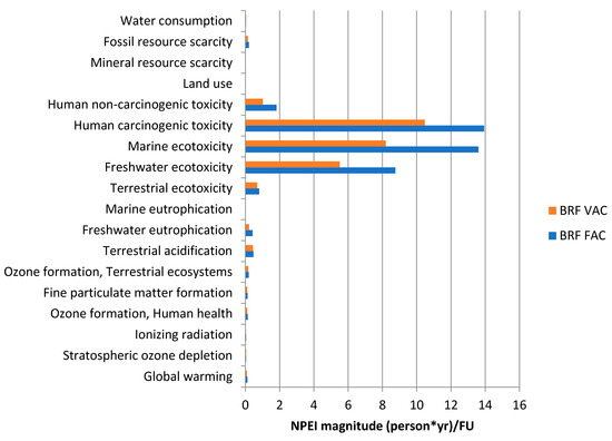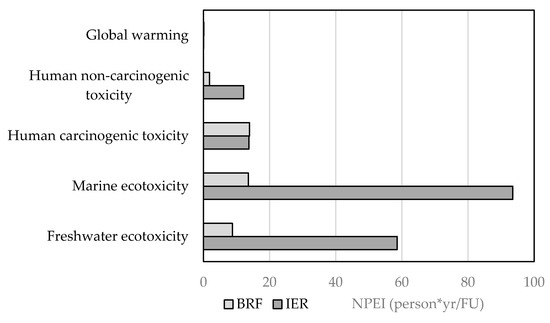 The comparative analysis of the IER and the BRF followed the steps previously presented in Section 2.1.3, comparing selected (i.e., the most important) PEIs and NPEIs: GW, FWEc, MEc, HNC, and HCT. In order to compare the values of a given category of potential environmental impact, PEIj, between two processes or technologies (i.e., between BRF and IER, for the same FU), we propose the variable μj below (Equation (6)), which indicates which technology is more polluting in this “jth” category of impact. The index μj is dimensionless and expressed as a percentage. The variable ∆μj (%) gives the percentage increase in the maximum impact with respect to the minimum impact, as defined by Equation (7) below.