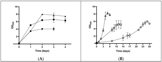Figure 1. Growth of Rhodococcus sp. 24CO on MSM1 measured at an optical density of 600 nm (OD600). (A) Fructose 1% (–▲–); mannitol; 1% (–◼–) and sorbitol 1% (–●–); (B) Glycerol 0.3% v/v (–o–); glucose 1% (–◻–) and gluconate 1% (–Δ–). Unless otherwise stated, prepared in w/v.