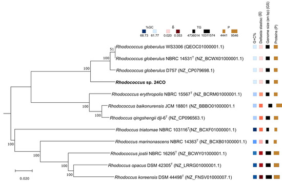The phylogenetic tree, calculated using the whole genome information from the TYGS, showed that Rhodococcus sp. 24CO clustered on a separate branch from other Rhodococcus species, being its closest species, with R. globerulus being its closest species (Figure 2). A deeper taxonomic analysis should be performed for a proper phylogenetic assignation of a new species.