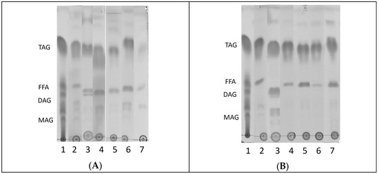Figure 3. TLC analysis of neutral lipids extracted from 24CO strain grown with different carbon sources. (A) MSM1. (B) MSM0.1. Lanes: 1. Mixture of neutral lipids used as control: triacylglycerol (TAG), diacylglycerol (DGAT), monoacylglycerol (MAG), free fatty acids (FFAs). 2. Mannitol, 1%. 3. Sorbitol, 1%. 4. Fructose, 1%. 5. Gluconate, 1%. 6. Glucose, 1%. 7. Glycerol, 0.3%.