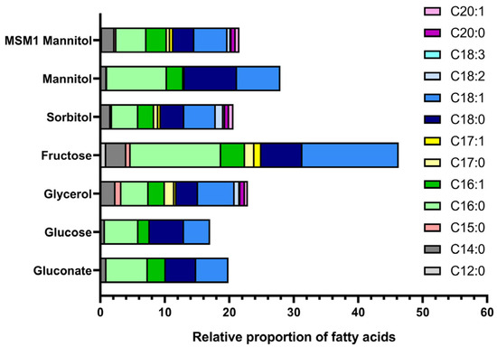Figure 4. Proportions of fatty acids of TAGs accumulated from different carbon sources. Unless stated otherwise, carbon sources were studied on MSM0.1.