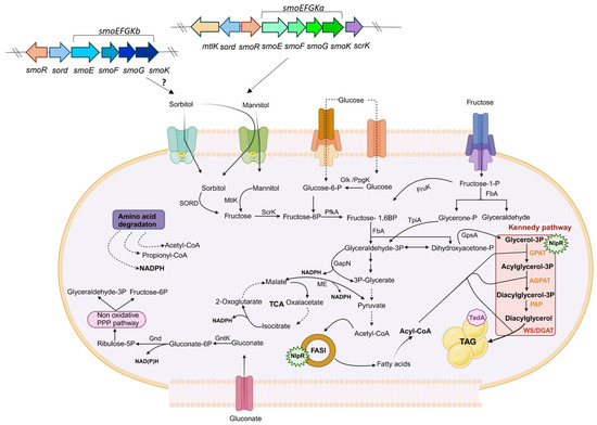 TAG synthesis requires precursors and cofactors supplied by various metabolic pathways, primarily those involved in glycolysis, such as the Entner–Doudoroff (ED) pathway, pentose phosphate pathway (PPP) and fatty acid synthesis. Using KEGG, RAST and BV-BRC, we reconstructed the potential metabolic pathway from a carbon source to TAG production (Figure 5). The catabolic pathways for glucose, gluconate and fructose were similar to those that have recently been described [20]. Natural polyols, found in its free form, have never been studied in Rhodococcus. Therefore, we focused on these carbon sources, which are abundant in olive leaves. The genome analysis of 24CO revealed two putative polyols transporters, which we named smoEFGKa and smoEFGKb. Furthermore, mannitol and sorbitol appeared to share the same transporter, being internalized via the polyol ABC transporter, smoEFGKa, which exhibited homology to smoKGFE from Mycobacterium smegmatis [47]. Interestingly, upstream of this transporter we identified genes encoding (i) the transcriptional regulator smoR, (ii) sorbitol-2-dehydrogenase SORD, and (iii) mannitol-2-dehydrogenase mtlK. Downstream of the ABC transporter, we found a fructokinase (scrK) gene (Figure 5). A second ABC transporter (smoEFGKb) that could be involved in polyol metabolism, was also identified. It has a similar topology to smoEFGKa but lacked mtlK and scrK. MtlK and SORD are likely involved in converting their respective polyols to fructose. As an intermediary in this pathway, fructose can enter the Embden-Meyerhof-Parnas pathway (EM) after phosphorylation to fructose 6-phosphate by scrK or be directed to the PPP if converted into glucose 6-phosphate (Figure 5).