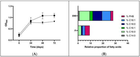 Figure 6. Growth and TAG accumulation results for Fresh Infusion (FI) and Dewatered Infusion (DWI). (A) Growth of strain 24CO in both media (–▼–: FI; –◼–: DWI). (B) Relative proportion of fatty acids in TAGs or PHB by cellular dry weight.