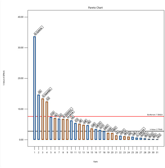 The experiment based on the 25 full factorial design showed a variation in the total enzymatic activity ranging from 49 to 4131 U L−1. These variations reflect the significance of amino acids in L-asparaginase production. The Box–Cox test was used to analyze the data to determine if it was normalized. The model obtained from the 25 full factorial design had an R2 of 99.86%, as determined by an analysis of variance (ANOVA), which is represented in Table 6. The significance level of the factors considered was determined using the Student’s t-test and p-value. A confidence level greater than 95% (α = 0.05) was used to determine statistical significance. The selected parameters are represented in the Pareto diagram of standardized effects (Figure 1). According to the results of the Student’s t-test and p-value performed by the Design Expert V13 software, most of the effects were significant using the Student’s t-test limit. Since only three factors were selected, factors with an absolute significance level (effects exceeding the Bonferroni limit) were considered. For each parameter, the model yielded absolute significance for the following factors: cysteine (D) (p-value < 0.0001); the interaction between cysteine and aspartic acid (DE) (p-value = 0.0007); aspartic acid (E) (p-value = 0.0009); and the interaction between arginine and aspartic acid (CE) (p-value = 0.0011).
