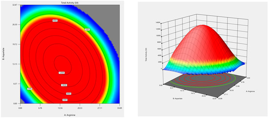 Figure 2 shows the effects of the evaluated amino acids (arginine, aspartate, and cysteine) on the production of double mutant L-asparaginase from D. dadantii. The contour and 3D plots in Figure 2 indicate higher total activity as the surface turns redder and lower in the navy-blue zone.