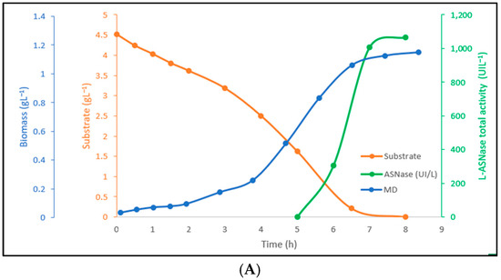 Additionally, the total activity of L-ASNase was calculated based on the biomass yield per liter of culture medium (Equation (3)). This calculation was necessary because the enzymatic activity only determines the activity per mL of extract and does not consider biomass concentration.