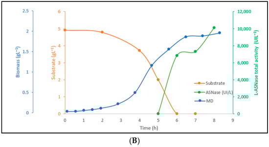 The yield of the LB medium could not be obtained because it does not contain glucose, and with respect to the yields of product from biomass and its specific rate of production, they gave negative values due to a decrease in the total L-ASNase activity. This happened due to the time in which the culture medium was induced. All the media were induced at 5 h; however, the LB medium, having a higher specific growth rate (µx (h−1)), reached the stationary phase at 3 h (Table 8). The optimal induction time for E. coli BL21 (DE3) for L-ASNase production has been studied, and it was observed that in the LB medium, the optimal induction time was at the end of the exponential phase [43]. The main reason for the reduction in L-ASNase is that the bacteria consumed the enzyme as a source of carbon and nitrogen due to the lack of nutrients in this phase [44].