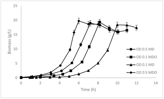 Initially, an evaluation of the initial biomass concentration was carried out to reduce the potential latency phase of the culture due to high glucose concentrations. The initial OD of the bioreactor cultures was assessed using the MD and MDO media in two tests, first at an initial OD of 0.1 (X = 0.0445 g L−1), and then at an initial OD of 0.5 (X = 0.2143 g L−1) (Figure 7). In the case of the microbial growth curve for MD with an initial OD of 0.1, a more prolonged latency phase can be observed compared to that obtained with an initial OD of 0.5, with a lag or delay of approximately 2 h. Additionally, a decrease in kinetic parameters is noticeable for the culture with an initial OD of 0.1, demonstrating that starting with an initial OD of 0.5 brings these parameters closer to those reported in the literature (Table 9). For this reason, an initial OD of 0.5 will be used for the upcoming bioreactor tests.
