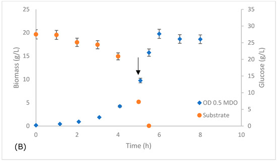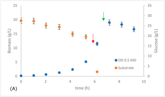 Figure 8. Growth and substrate consumption kinetics of E. coli BL21/pET-15b-Erw_DM in (A) MD with an initial OD of 0.5, including induction times in the mid-exponential phase (Red arrow) and late exponential phase (Green arrow); (B) MDO with an initial OD of 0.5, featuring the induction time in mid-exponential phase (Black arrow).